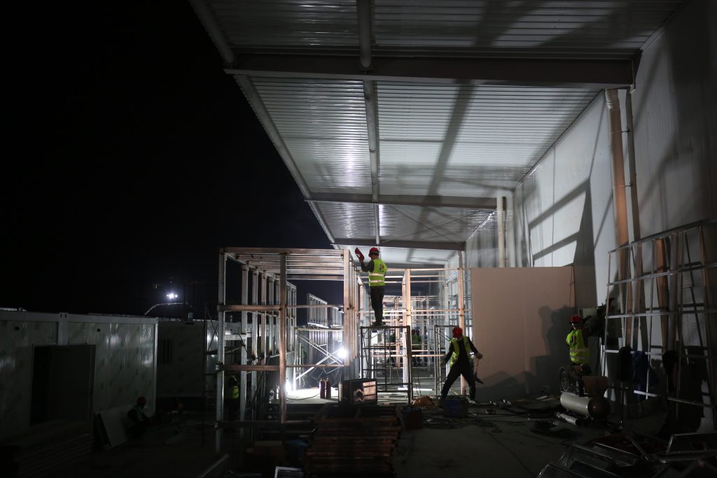 大干快干、爭分奪秒。各小組交差施工,同步作業,24小時晝夜鏖戰。為順利交付,施工人員常常席地而睡,用血肉之軀,頑強意志建設“生命之舟”。240個小時,按時交付方艙醫院。