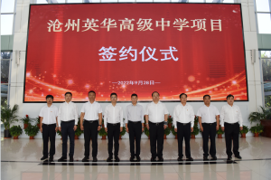 9月28日上午,滄州市經濟開發區管委會隆重舉行滄州英華高級中學項目簽約儀式。滄州市人民政府副市長尹衛江、滄州經濟開發區黨工委書記、管委會主任趙寶良、黨工委委員、副主任蔣福森、李長鑫、投資促進局局長孫博、大元集團黨委書記、董事局主席李建國、大元投資集團副總裁郝書明、大元實業發展集團總裁王俊超、衡水市教育機構校長高輝、河間市英華高級中學校董許紅東等人參加簽約儀式。 滄州英華高級中學全面借鑒衡水先進教育